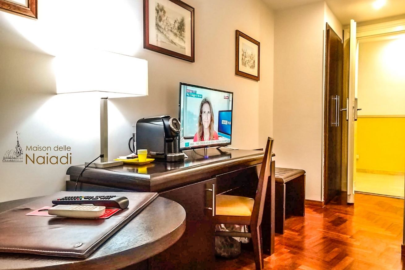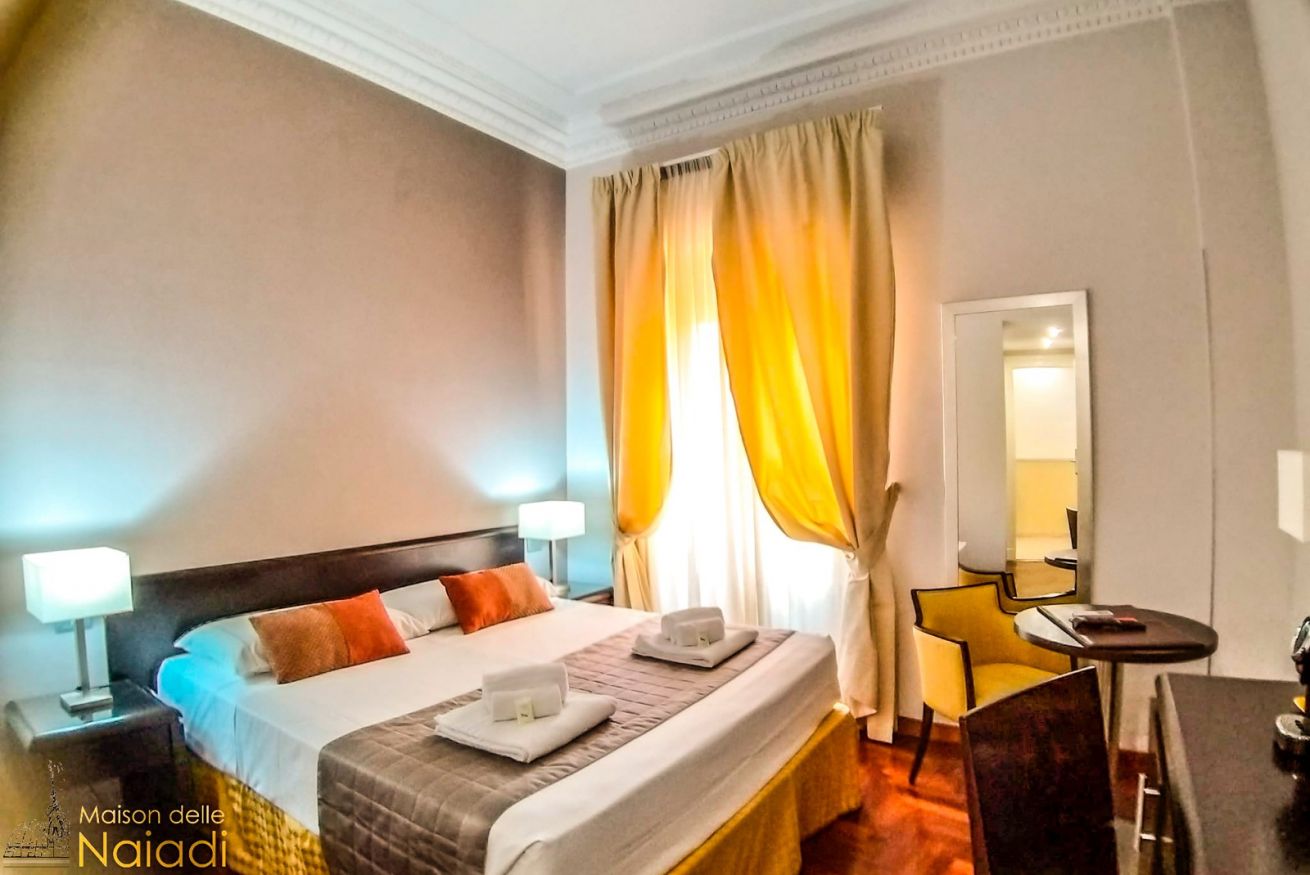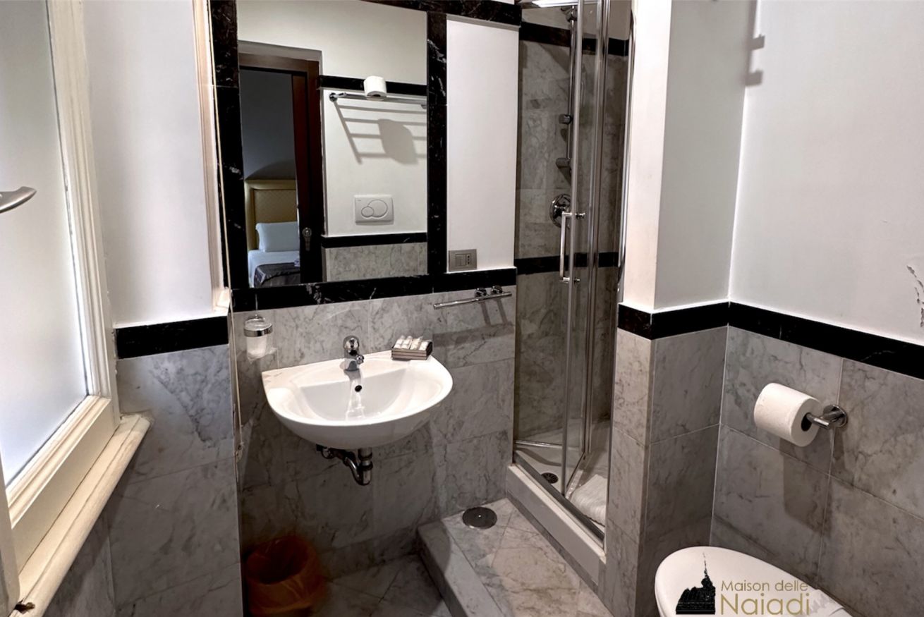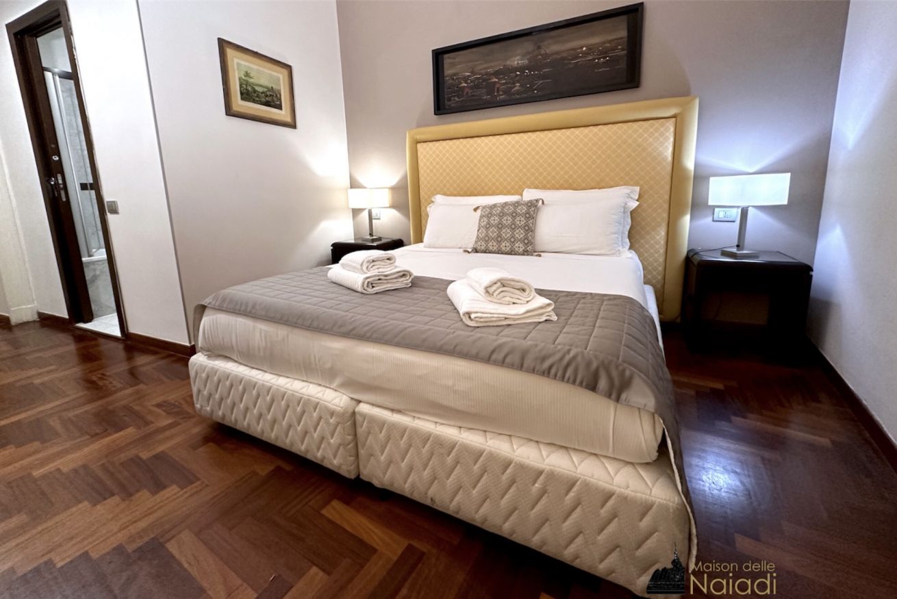 La camera doppia può essere richiesta con un letto matrimoniale o con due letti singoli. I letti singoli sono larghi 90 cm e lunghi 200 cm. Arredata con mobili in legno, pavimenti in parquet originale e bagni in marmo di carrara.